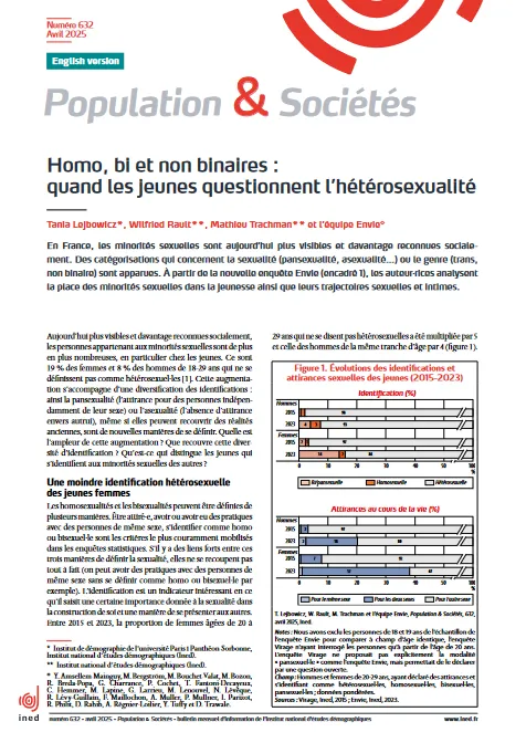 LEJBOWICZ Tania, RAULT Wilfried, TRACHMAN Mathieu & the ENVIE team, « Gay, bisexual, and non-binary: When young people question heterosexuality », Population & Societies, 2025 (N° 632), p. 1-4.