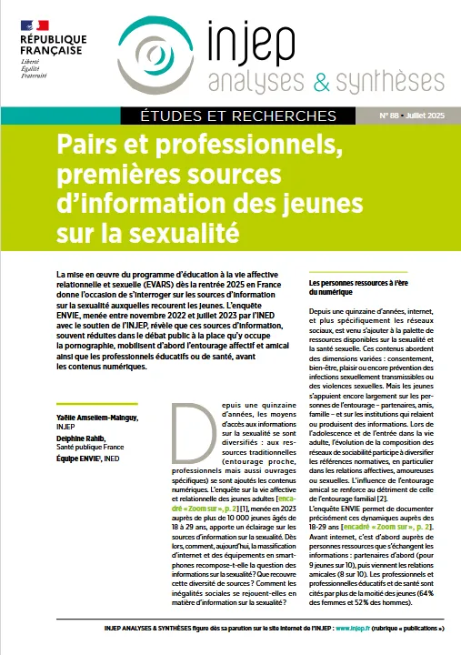 AMSELLEM-MAINGUY Yaëlle, RAHIB Delphine & l’équipe Envie, « Pairs et professionnels, premières sources d’information des jeunes sur la sexualité », Injep analyses & synthèses, 2025 (N° 88, juillet), p. 1-4.